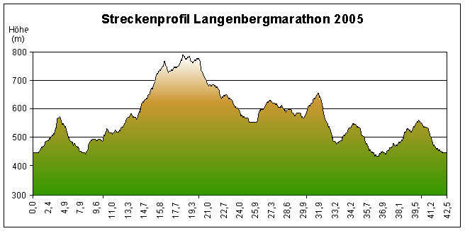 Höhenprofil der Marathonstrecke 2005 mit Einführungsrunde (ca.9km) / Start in Bruchhausen