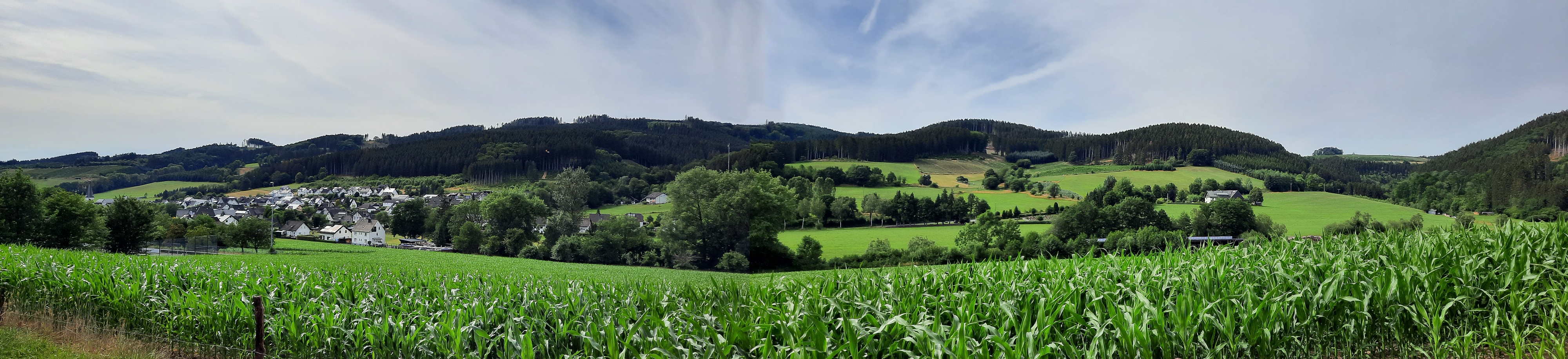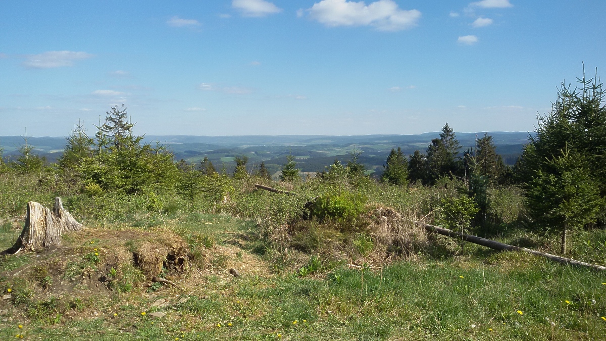 gekennzeichnet) folgen. Oben an der Bank (km 5,4) rechts und auf den höchsten Punkt des Naturparks Homert, benannt nach dem Berg "Der Homert". Sturmtief Kyrill hat im Januar 2007 die Gipfel rasiert und so hat man NOCH einen wunderbare Panorama-Aussicht über das "Land der 1000 Berge".