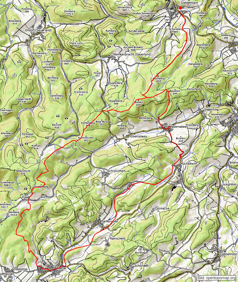 Wir halten uns nördlich, vor dem Friedhof / Sportplatz geht es rechts rein und wir fahren den Salwey-Rundweg S4 quasi in gerade Richtung bergauf, wieder auf die Homert. An dem sattelpunkt mit der 5-Wege-Kreuzung geht es weiter links rauf und wir treffen an der Bank wieder den Homertkammweg, den wir nun bequem bergab bis Grevenstein zurückfahren können.