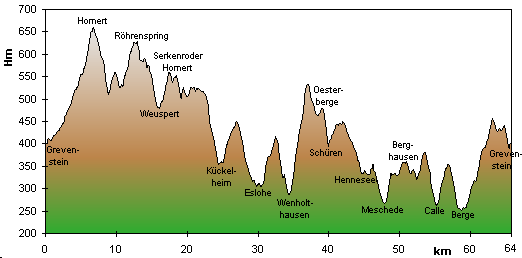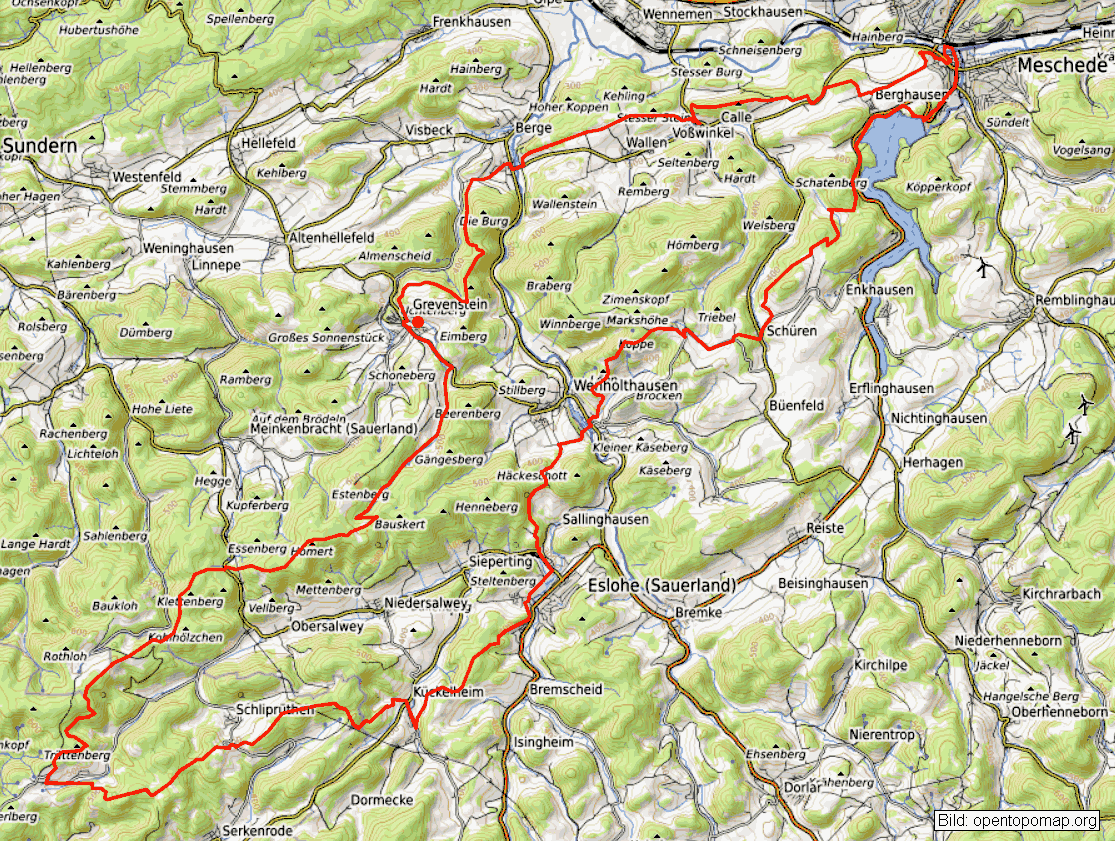 Jetzt kommt ein 2 km langer Anstieg, im Mittel 12 % steil, auf den Oesterberge. Oben geht es rechts runter, am Gasthof Quinkert vorbei, die Strasse links runter, Richtung Schüren. Am Waldrand biegt der X22 links ab und geht steil nach Schüren runter. An der Einfahrt zum Flugplatz vorbei und dann links auf den Feldweg und der Markierung X folgen, dann runter zum Hennesee. Wir queren die B55 und nach ca. 250 m geht es rechts runter zur Badebucht und dann weiter zum Staudamm. Kurz vor Beginn der Staumauer am kiosk links den Pflasterweg runter in die Stadt Meschede, an der Kirche vorbei, zum Bahnhof.