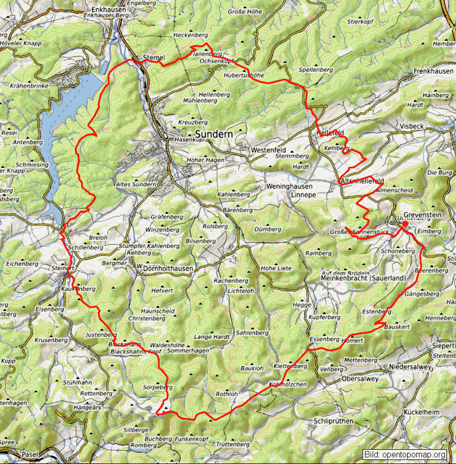 An der Hauptstrasse verlassen wir den X24 und fahren weiter den Talsperrenpfad (markiert mit einem auf dem Kopf stehendem T), ein paar Meter rechts entlang der Hauptstraße und dann links rein, in die Straße "Zum Giebel" rauf. Am Waldrand rechts rein und immer weiter hoch, bis wir ganz oben auf den Querweg treffen. Hier folgen wir nach rechts dem mit "O" markierten Arnsberger Höhenrundweg. Wir überqueren zunächst die Landstraße Arnsberg-Sundern, auf dem sogenannten Ochsenkopf (bei Motorradfahrern sehr beliebt), weiter geradeaus dem "O" folgen, am Hubertuspöstchen vorbei und dann überqueren wir die Landstraße Arnsberg-Hellefeld. Vor der Einfahrt zur Deponie der Hellefelder-Höhe verlassen wir den Arnsberger Höhenrundweg und bleiben nun auf dem Butterbettchenpfad, mit einem weißen Dreieck markiert. Das Dreieck bringt uns über die Hellefelder Höhe runter in den Ort Hellefeld. unten im Tal, am Ortsanfang halten wir uns aber am Friedhof geradeaus, bis zur Kirche und dann bis zur Hauptstraße. Hier waren wir bereits auf dem Weg "H1" und wir folgen diesem Zeichen, an der Hauptstraße wenige Meter rechts und dann links runter. Durch die Weiden und rauf bis oben auf den Bergrücken. Hier treffen wir wieder auf ein bekanntes Wegezeichen, das wir schon öfter sahen, die markierung "AT". Der sogenannte Rundweg Altes Testament. Diesem folgen wir runter in den Ort Altenhellefeld, links an der Wacholderheide rauf, vorm Bauernhof rechts, zur Streue.