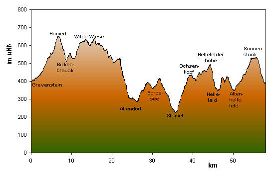Sehr gut vom sauerländischen Gebirgsverein markierte Strecke, häufig anspruchsvoll,