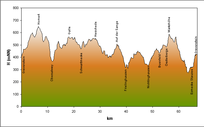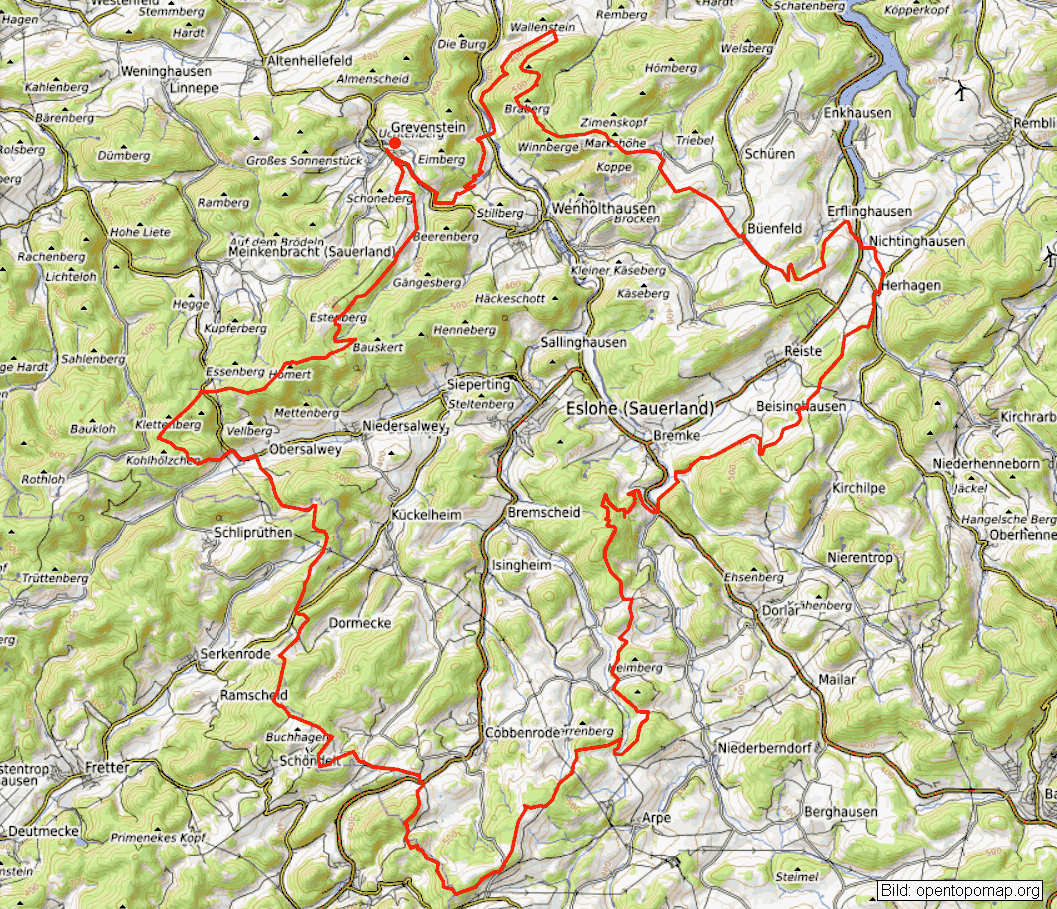 Wir queren die B55 und es folgt ein kurzes Stück auf asphaltiertem Weg hoch Richtung Erflinghausen. Oben nach der Kuppe am Haus aber wieder links rein und weiter rauf. Oben auf dem Plateau bis Büenfeld, an der Kreuzung links und sofort wieder rechts in den Seitenweg. In gerader Linie am Schweinemastbetrieb vorbei, über die Kuppe, rechts sehen wir den Segelflugplatz Schüren, geradlinig weiter, am Jaitstein vorbei bis nach Oesterberge. Wir halten uns an den Häusern links und es geht hoch zur Markshöhe (591mNN). Links ab, am Startplatz der Drachenflieger vorbei (herrliche Aussicht), weiter bis zum Winnberge, um Braberg und Sülzberg herum und dann runter Richtung Wallenstein. An der Scheune geht es links im weiten Bogen (mit Blick über den Diabas-Steinbruch Berger Hammer) runter ins Wennetal. Bei Gut Blessenohl überqueren wir die Wenne, kreuzen die Landstraße Wenholthausen-Berge und es geht zum Esmeckestausee. Armin's Station ist eigentlich immer geöffnet und bietet eine schöne ruhige Umgebung am See mit Blick hoch zum Beerenberg zur Pause und Erfrischung, bevor der Schlussanstieg hoch zum Eimberg und wieder zum Ausgangspunkt nach Grevenstein führt.