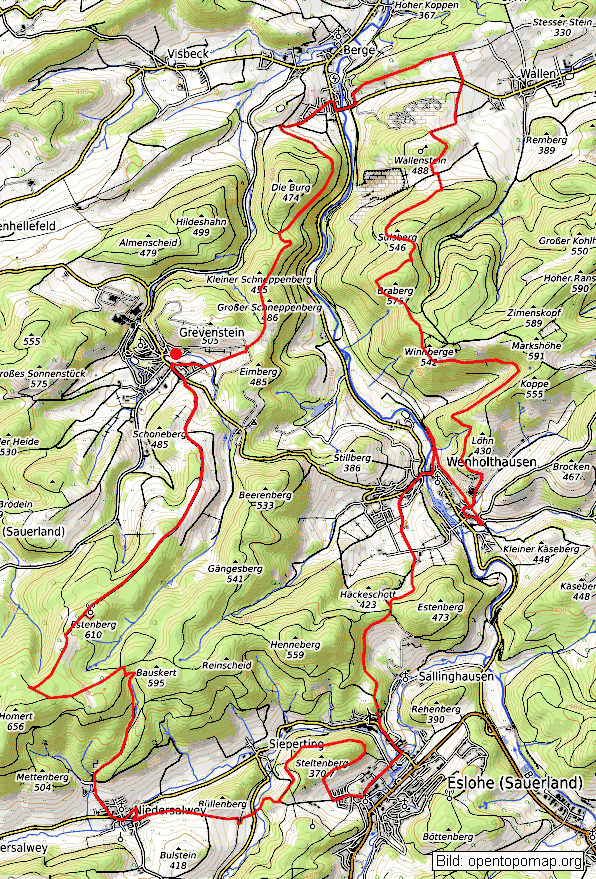 Nun ist man "auf der Linde", dem Scheitelpunkt zwischen den Ortschaftenen Berge und Wallen. Man kreuzt die Landstrasse und nach ca. 300m geht es links den Kreuzweg runter nach Berge. Unten angekommen, kreuzen wir den Sauerlandradring, über die Wennebrücke, zur Kreuzung (links gehts nach Wenholthausen), dort aber rechts und sofort wieder links in den Burgweg abbiegen, den Weg durch das Wohngebiet hoch, bis zum Bildstock und dann links rein. Dem Weg einfach folgen. An der 5-Wege-Kreuzung angelangt und nimmt den Weg X13 links, Richtung Grevenstein. Nach 800m hat man den Scheitelpunkt erreicht und kan dem X13 weiter folgen oder am Waldrand einfach geradeaus rollen. An der Bank vorbei runter rollen nach Grevenstein.