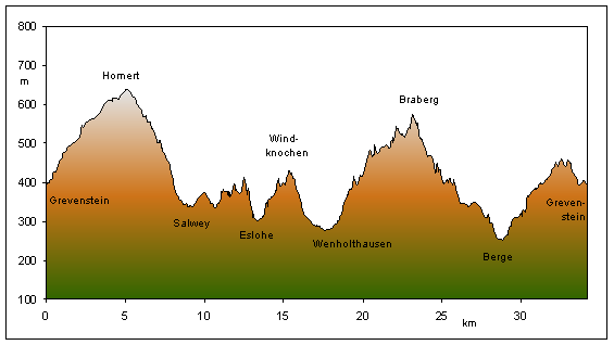 ab. Nun geht es 250 Höhenmeter bergauf, vorbei am BW-Funkturm, nach Müllers Stein links