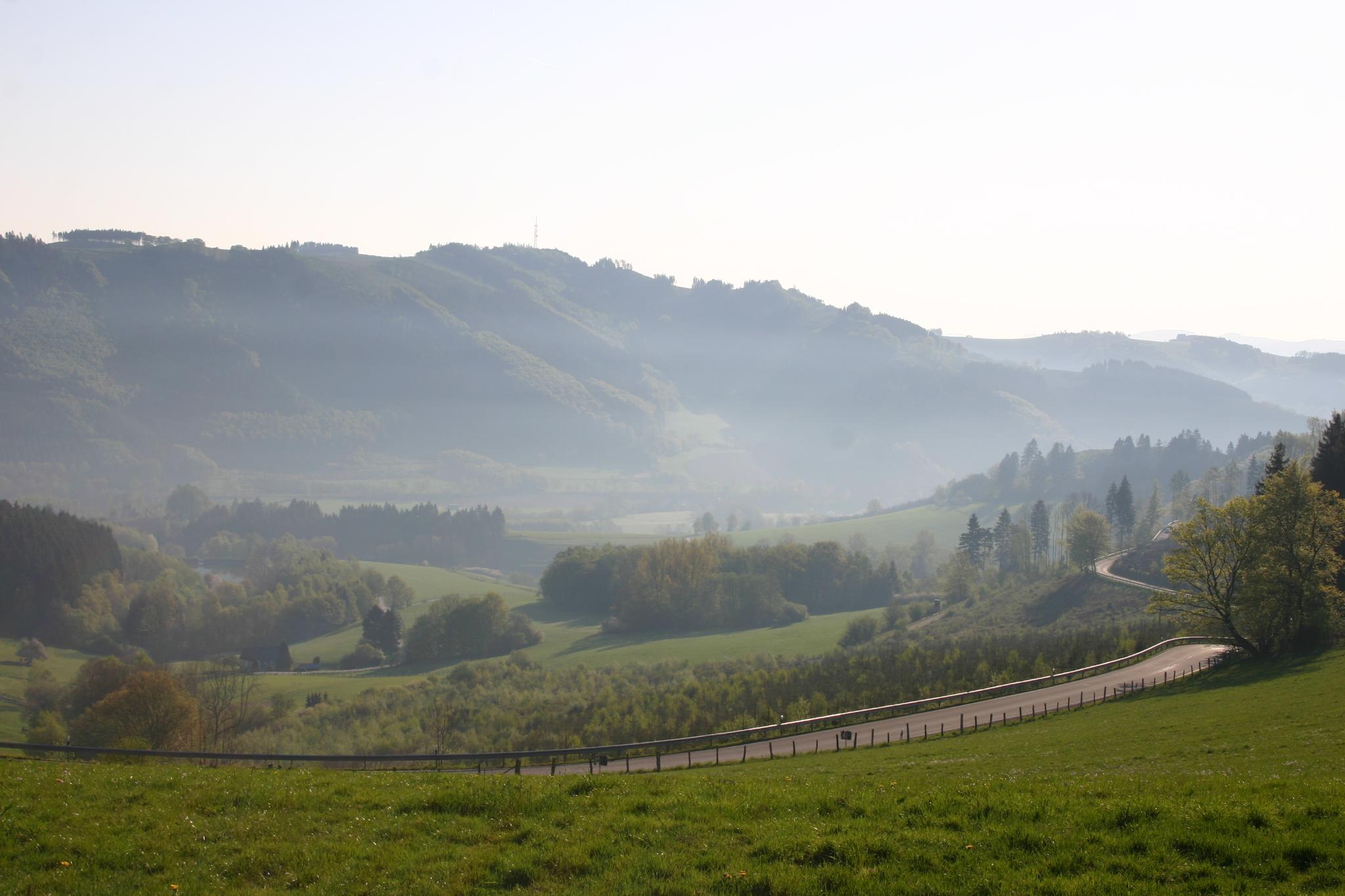 und über die Kuppe in schneller Fahrt bis zur Kreuzung der B55. Links halten und in der Ortsmitte von Oedingen rechts hoch: Bracht/Schmallenberg. Ein gut zu fahrender Anstieg, der oben auf der Höhe kurz vor Bracht eine wunderbare Fernsicht zeigt. Links und rechts rahmen die Hunau über Bad-Fredeburg und der Rothaarkamm, mit ihren über 700m hohen Gipfeln, das sogenannte Haverland ein.