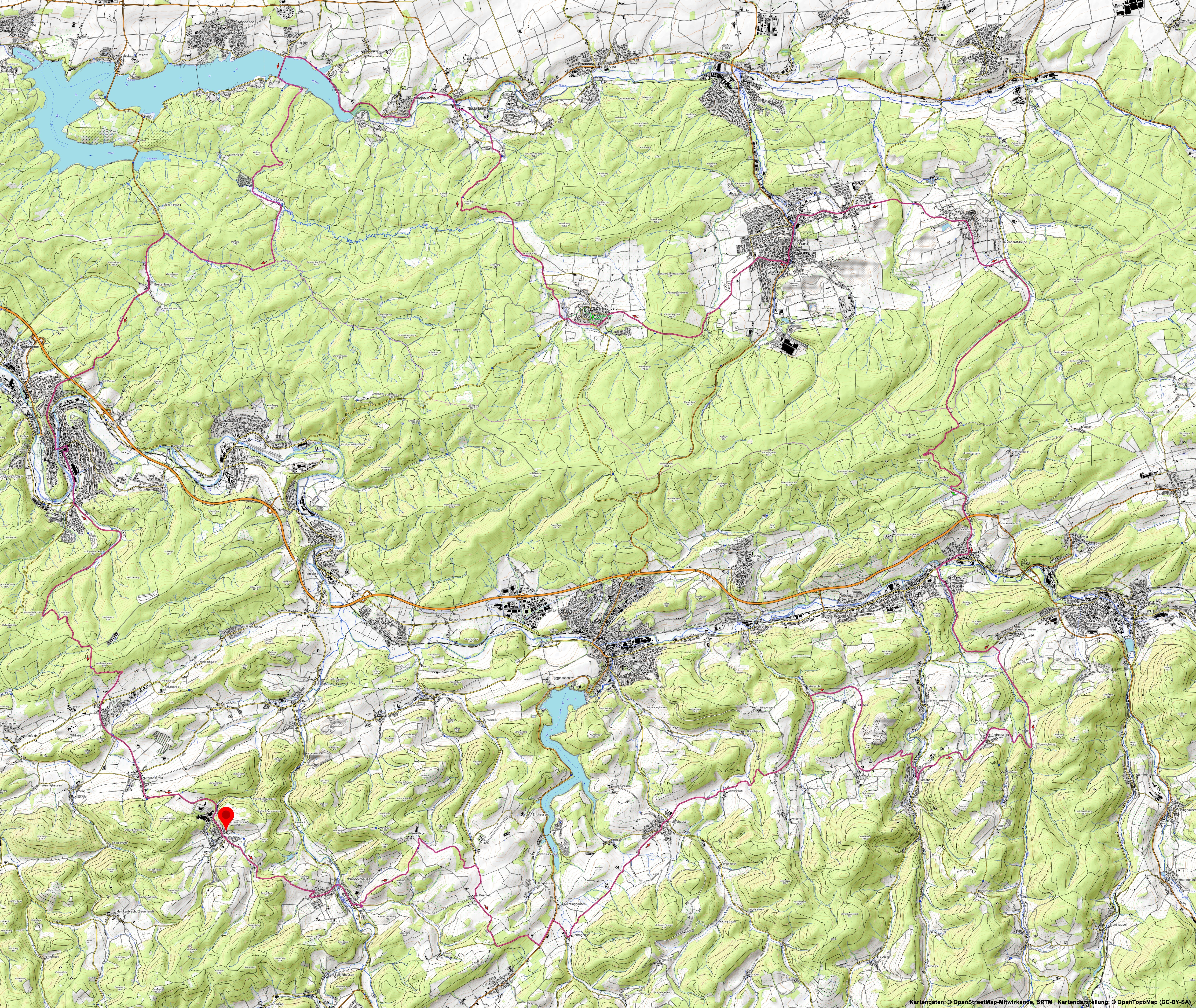 Die Abfahrt durch den Kallenhardter Wald ist wenig steil und so heißt es: Hände an den Unterlenker und Tempo 50 treten. Unten in der Talsenke geht es dann links ab und hoch in den Ort Kallenhardt. Durch den historischen Ortskern, dann runter in die Talsohle und rauf nach Suttrop. Durch diesen Ort geradeaus hindurch, runter in die Stadt Warstein. An der Ampel links auf die B55 und durch die Innenstadt. Nach 1000m geht es rechts ab auf die L735 nach Hirschberg, vorbei am Verwaltungsgebäude der Brauerei und runter ins Tal. Ab der Bilsteinhöhle geht es wieder bergan, bis Hirschberg. (Hier geht es in der Radbundesliga die "Hirschberger Wand" hoch mit 33% Steigung. Hier die Adresse Straße "Berghang" in google.maps, oder siehe in grün in der obigen Karte in höherer Auflösung). Es geht links um den (Hirsch)Berg herum ins Bachetal.