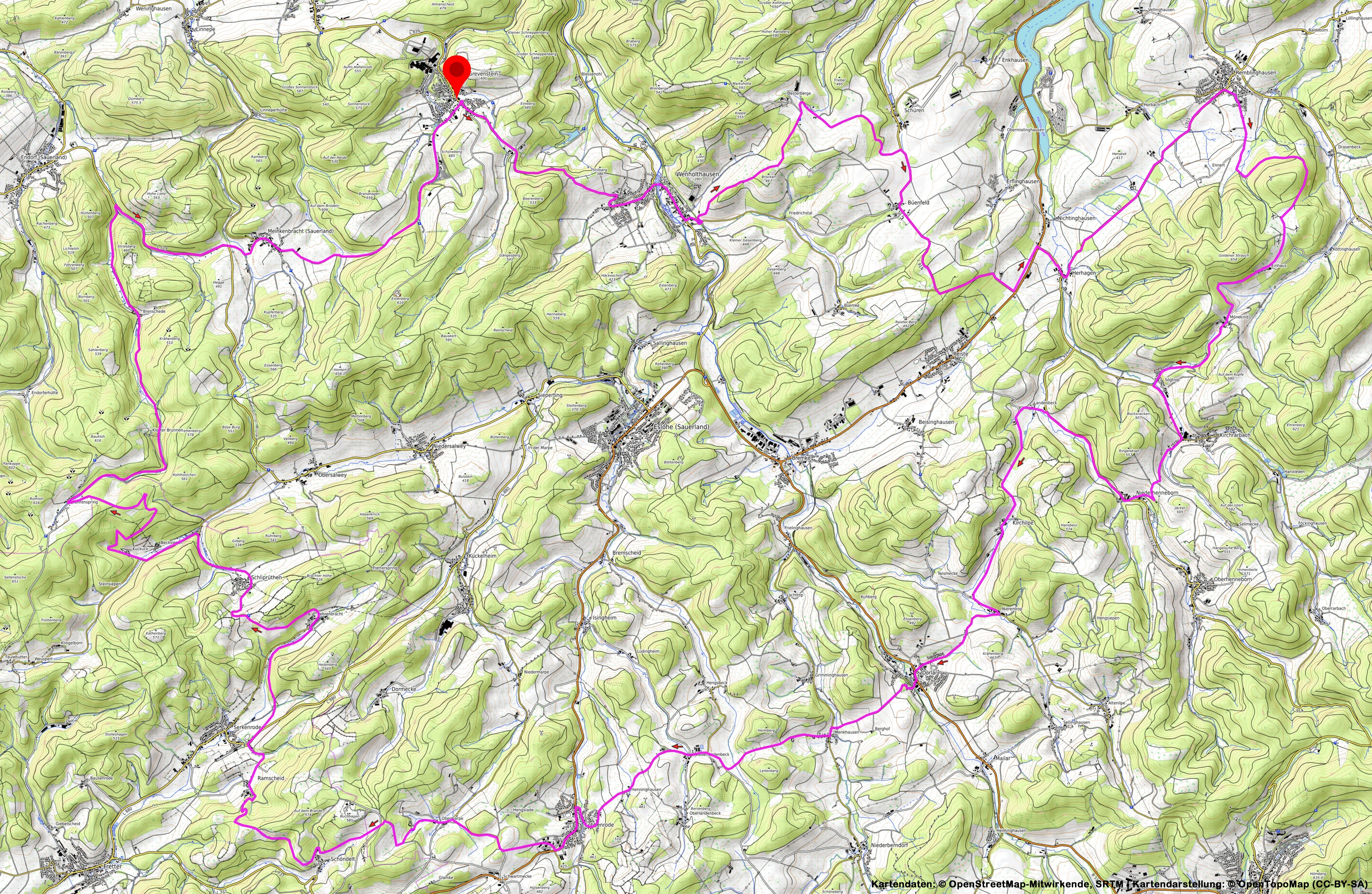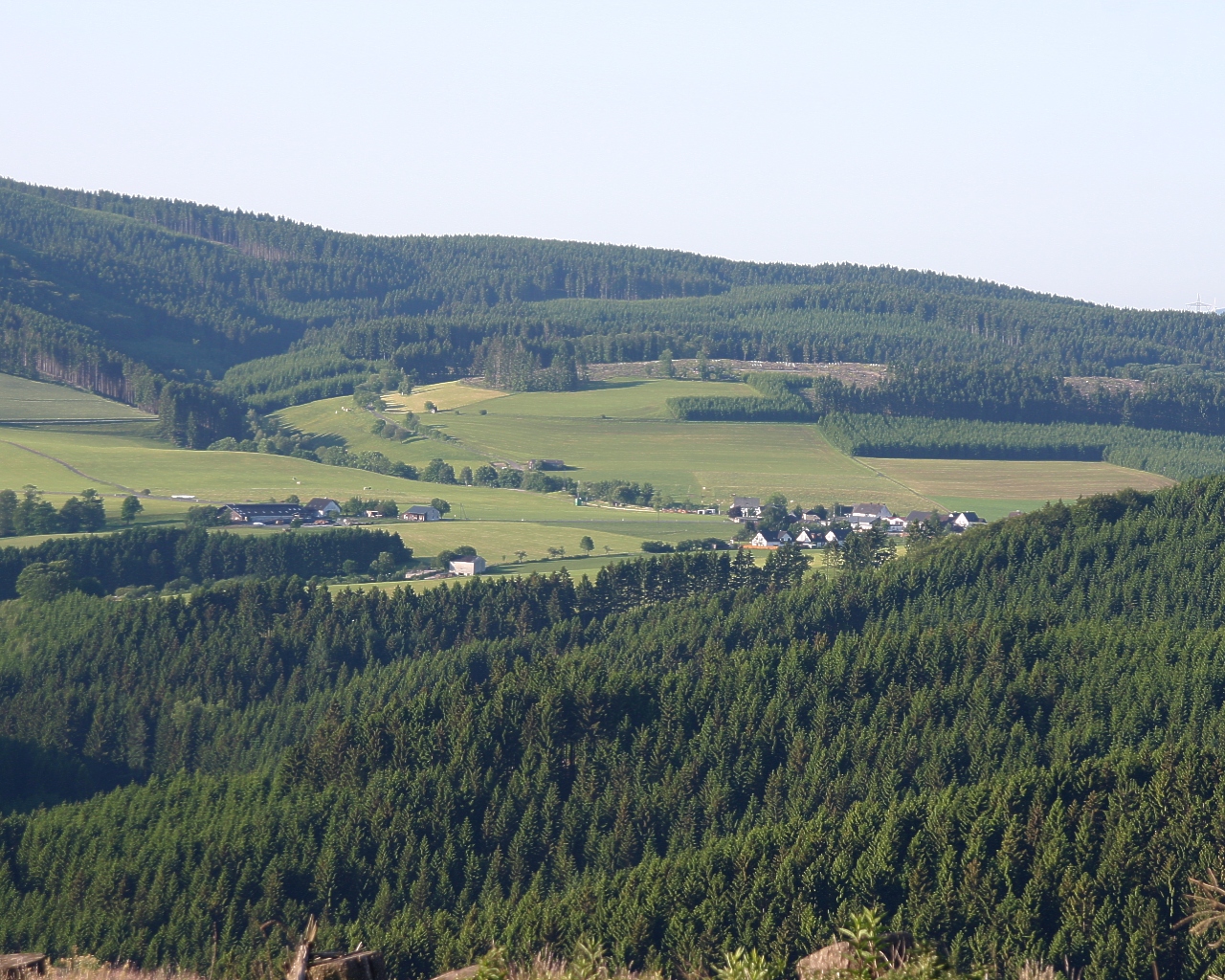 Wir bleiben auf der Kreisstraße, fahren an den zwei Gehöften vorbei, weiter bis in das Tal. An der Kreuzung (links nach Schüren) fahren wir rechts nach Büenfeld, eine kleine Kuppe hoch, weiter durch den Ort, in Richtung Reiste. Am Ortsende haben wir rechts einen schönen Blick, weit in das Salwey-Tal und rechts davon über die Homert (der massive Bergrücken). Nach der steilen Abfahrt, runter nach Nichtinghausen, kommen wir zur Bundesstraße. Hier fahren wir 750m links den Radweg runter und am Ende des Radweges, an der Tankstelle, biegen wir rechts ab, nach Herhagen. Im Ort geht es an der Kreuzung links, Richtung Remblinghausen. Nach rund 4km geht es in der Ortsmitte dann rechts ab, Richtung Sportplatz und weiter hoch nach Einhaus (besteht mittlerweile aus drei Häusern!) und weiter nach Möhnekind. jetzt beginnt eine schnelle Abfahrt, runter in den Ort Sögtrop. Unten an der Kreuzung links, Richtung Kirchrarbach. Und nach nur 1000m geht es in Kirchrarbach rechts ab, und hoch über die Kuppe nach Niederhenneborn. Unten halten wir uns rechts, talabwärts bis Landenbeck. Hier biegen wir links und dann wieder links ab, hoch nach Kirchilpe. Von Kirchilpe geht es talwärts bis Nierentrop und dann rechts hoch über die Kuppe und dann runter nach Dorlar. Hier queren wir die B511. Erst links und nach 100m rechts ab, Richtung Menkhausen. Bevor der Steilanstieg beginnt, kreuzen wir den Sauerlandradring.