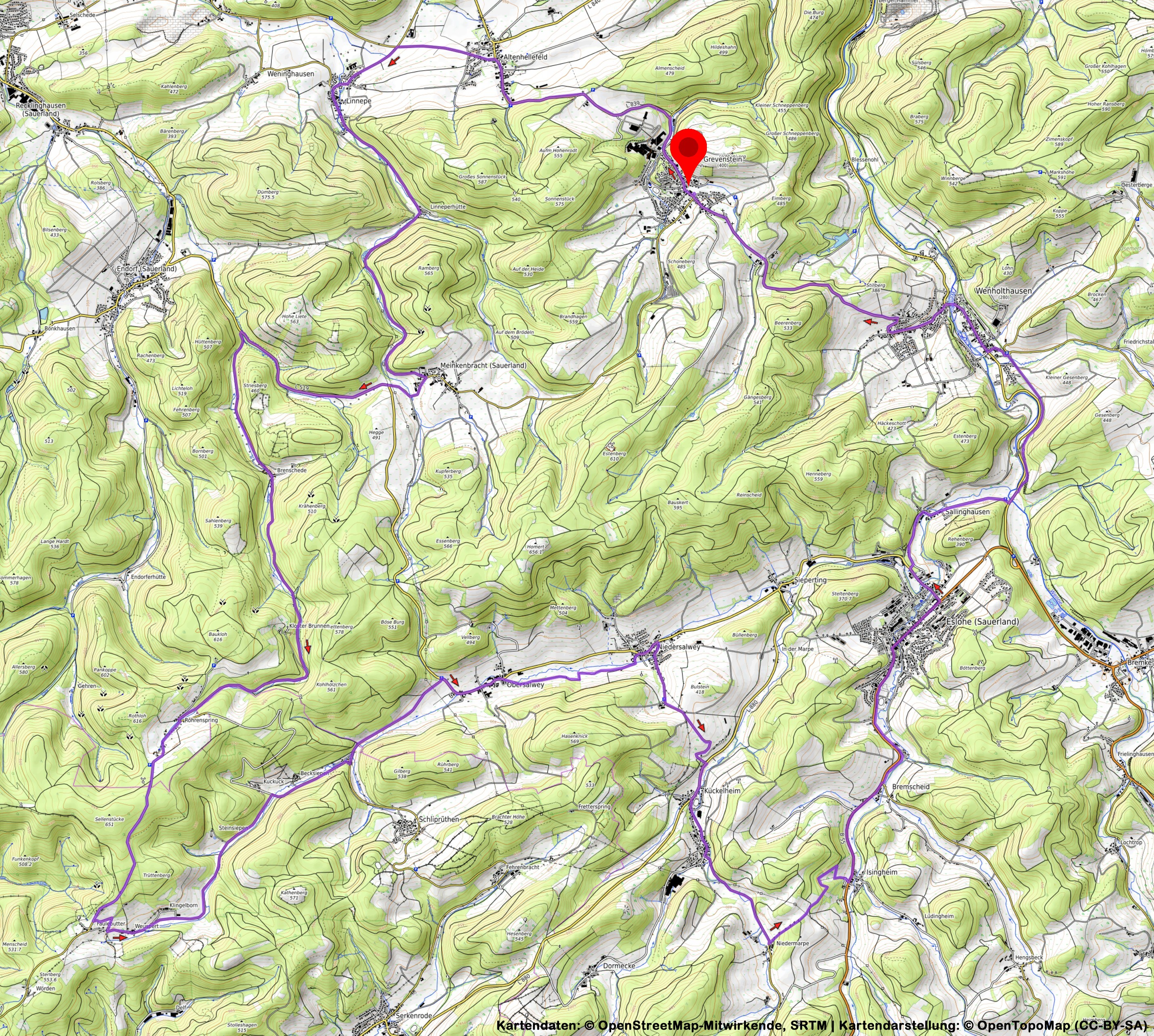 Vom Parkplatz geht es die Landstraße rechts runter, durch Grevenstein, an der Brauerei vorbei und dann links rauf, Richtung Altenhellefeld. Oben haben wir einen Blick über das tal, auf das sogenannte "Alte Testament". Nach kurzer schneller Abfahrt geht es in der Ortsmitte links ab, Richtung Sundern. Nach gut einem Kilometer geht es wieder links ab, und durch den Ort Linnepe. Diesem "Linneper-Bach"-Tal geht es nun auf frisch asphaltiert Straße bergauf, bis in den Ort Meinkenbracht. An der Kreuzung rechts runter, durch die Senke und über die Kuppe weiter geradeaus, Richtung Endorf/Sundern, bergab, bis zur Kreuzung nach Klosterbrunnen/Brenschede. Nun geht es links das Röhrtal bergauf, durch Brenschede, vorbei an Klosterbrunnen und in den Ort Röhrenspring. In der 180°-Kurve im Ort aber rechts halten und weiter bergan. Es geht über den höchsten Punkt der Tour und dann hinab in den Ort Weuspert. Wir treffen vor Faule-Butter die Kreisstraße 29 der wir nach links talabwärts durch den Ort Weuspert folgen. Nun geht es das Salweytal runter, am gleichnamigen Bach entlang, bis in den Ort Obersalwey. Wer das Tempo weiter genießen will, bleibt auf der Kreisstraße, wer es einen Moment ruhiger haben möchte biegt in Ortsmitte rechts auf den neuen Radweg ab. In Niedersalwey treffen beide Wege wieder zusammen und in der Ortsmitte geht es an der Kreuzung rechts ab, und dann den Hasenknick rauf und nach der Kuppe runter, weiter zum Ort Kückelheim. Nach der Abfahrt kreuzen wir den sogenannten Sauerlandradring, mit seinem Markenzeichen, dem Fledermaustunnel, ganz in der Nähe. Wir halten uns rechts, Richtung Kückelheim, am Ortseingang links und in der Ortsmitte wieder links, Richtung Niedermarpe.