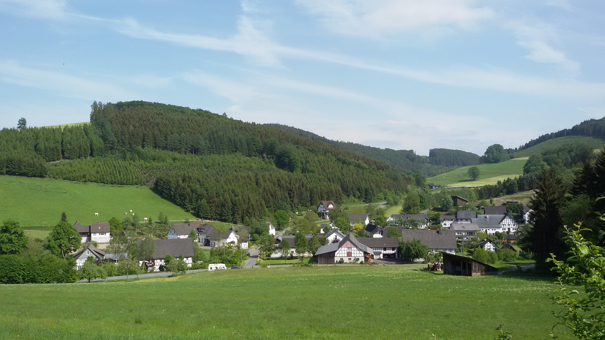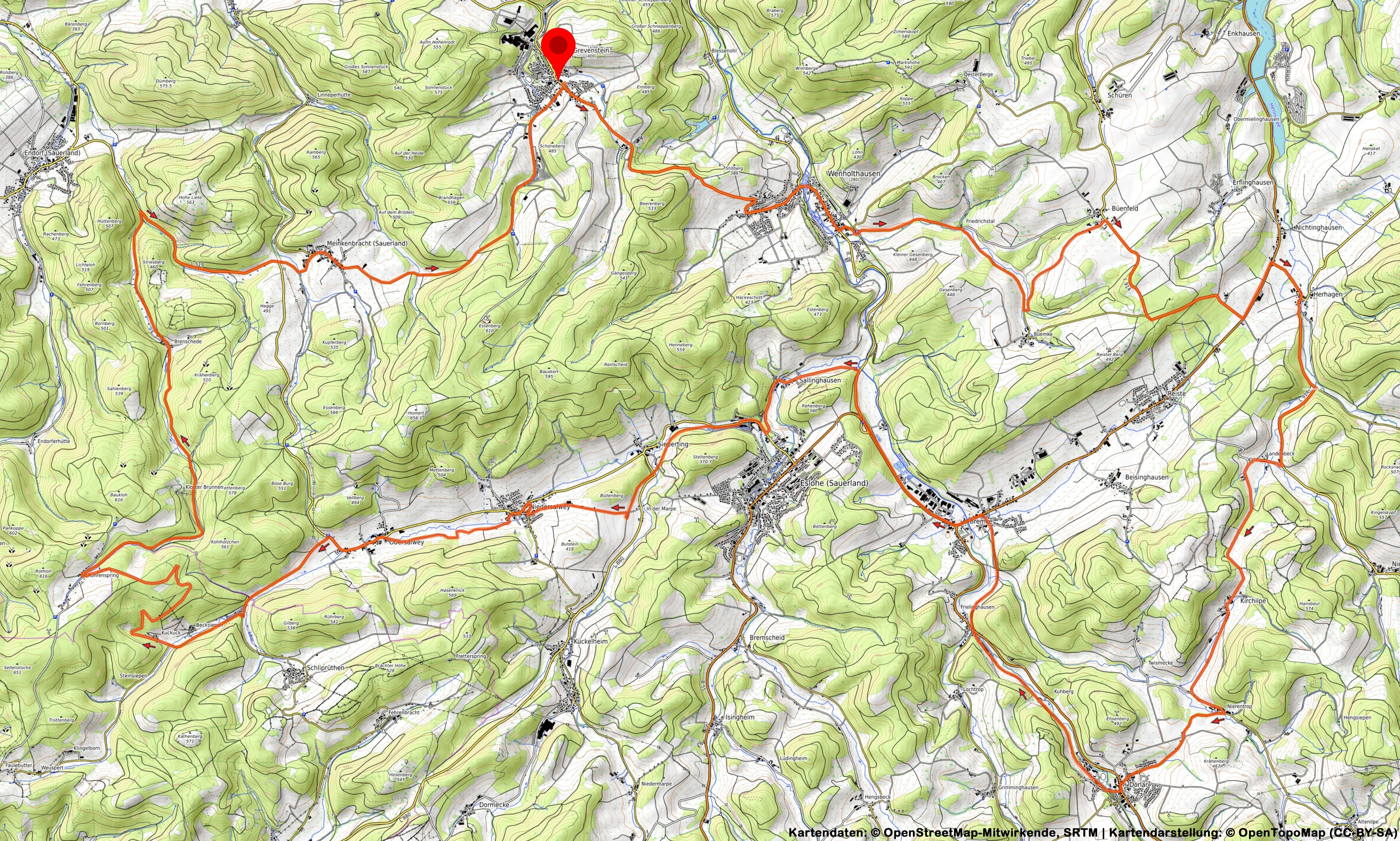 Es geht runter nach Wenholthausen, auf derzeit holpriger Landstraße. Durch den Ort, an der Wennebrück rechts und kurz dann dem Gasthof Sauerländer Hof links rein, Richtung Büemke. Auf neuer Asphaltdecke derzeit sehr gut zu fahren. Kurz vor Büemke geht es einen schmalen Asphaltweg durch die Feldflur bergauf in den Ort Büenfeld. Hier oben halten wir uns an der Straße rechts und es geht über die Wilhelmshöhe runter bis zur Bundesstraße. Hier ein kurzes Stück den Radweg runter nach Nichtinghausen und dann am Ortseingang die B55 queren und den Radweg nach Herhagen und weiter der Straße Richtung Kirchrarbach folgen. Eine hundert Meter nach dem Ortsende von Herhagen geht es rechts ab, nach Landenbeck und dort rechts in den Weiler hinein und vor der Kapelle links ab und dem Tal aufwärts folgen bis zur Kuppe und runter nach Kirchilpe. Durch den Ort talabwärts, an der 1000-jährigen Eiche vorbei bis Nierentrop. Rechts die Landstraße rauf und dann runter in in Ort Dorlar. Wir queren die Straße und kommen zum Sauerlandradring, auf dem wir rechts in Richtung Bremke fahren. In Frielinghausen überqueren wir die B511 und Bremke überqueren wir wieder die B55 und es geht links, auf dem Sauerlandradring weiter, bis zur Wennebrücke. Hier geht es für uns links auf dem Radring weiter (geradeaus beginnt die Hennesee- oder auch Nordschleife genannte Bahntrassenrunde).
