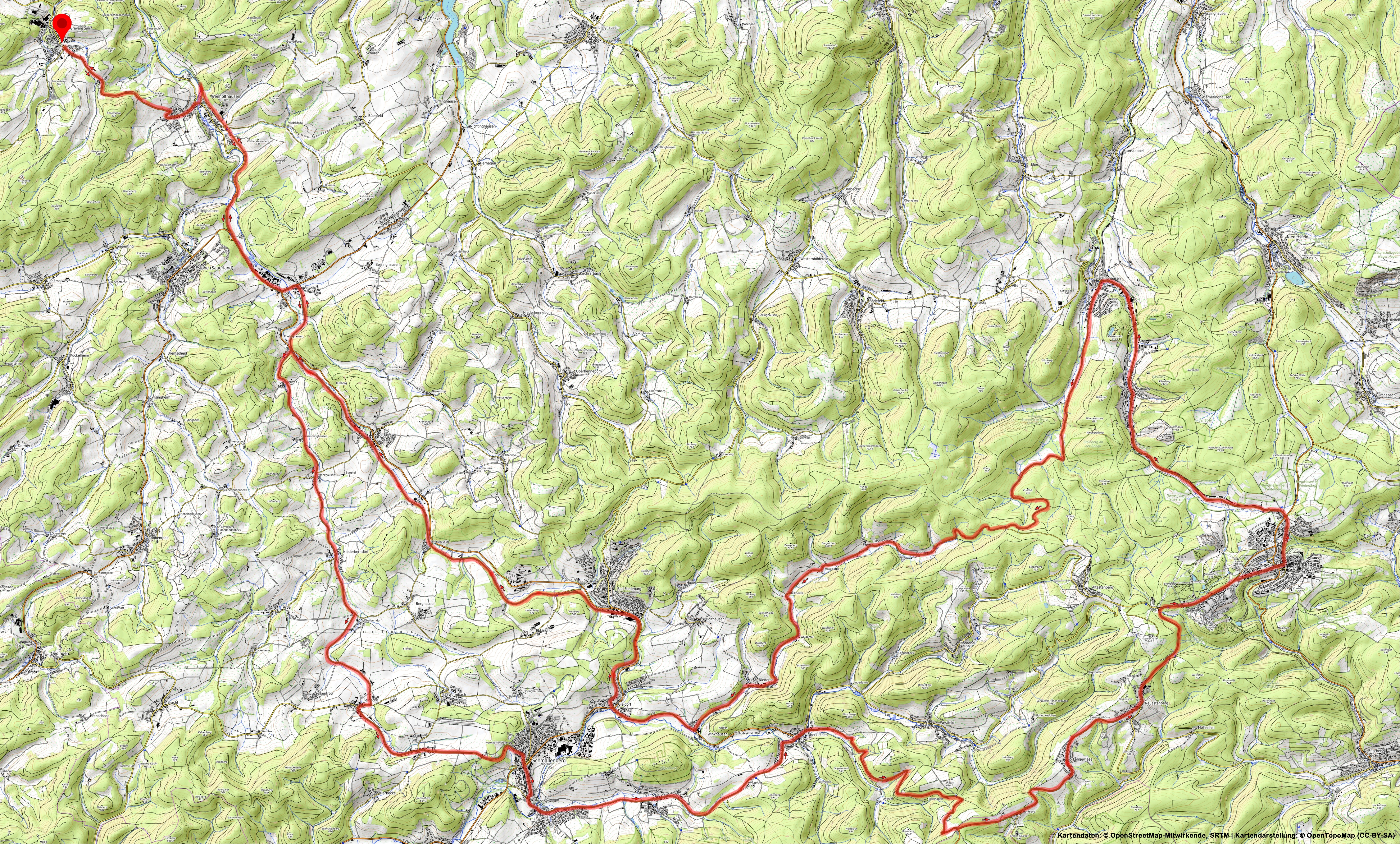 In Wenholthausen geht es rechts über die Wennebrücke und dann sofort links rein, bis zur zum Sauerlandradring/Henneseeschleife stoßen. Dort sofort scharf recht und es geht auf der ehemaligen Bahntrasse an Wenholthausen vorbei, bis runter ins Wennetal. Nach der Wennebrücke bleiben wir in gerader Linie auf den Radweg, parallel zur Straße. Jetzt sind wir auf dem sogenannten Sauerlandradring und halten uns auf diesem bis Bremke. Am Ortseingang wechseln wir die Straßenseite und in 200m nach der Ortsmitte gehts es rechts ab, den Sauerlandradring Richtung Fredeburg. Im folgenden Ort Frielinghausen verlassen wir den Radweg und es geht Richtung Niederborndorf/Berghausen. Jetzt geht es das Wennetal weiter aufwärts, verkehrsarm, durch die Orte Lochtrop, Grimminghausen, Menkhausen, Niederberndorf