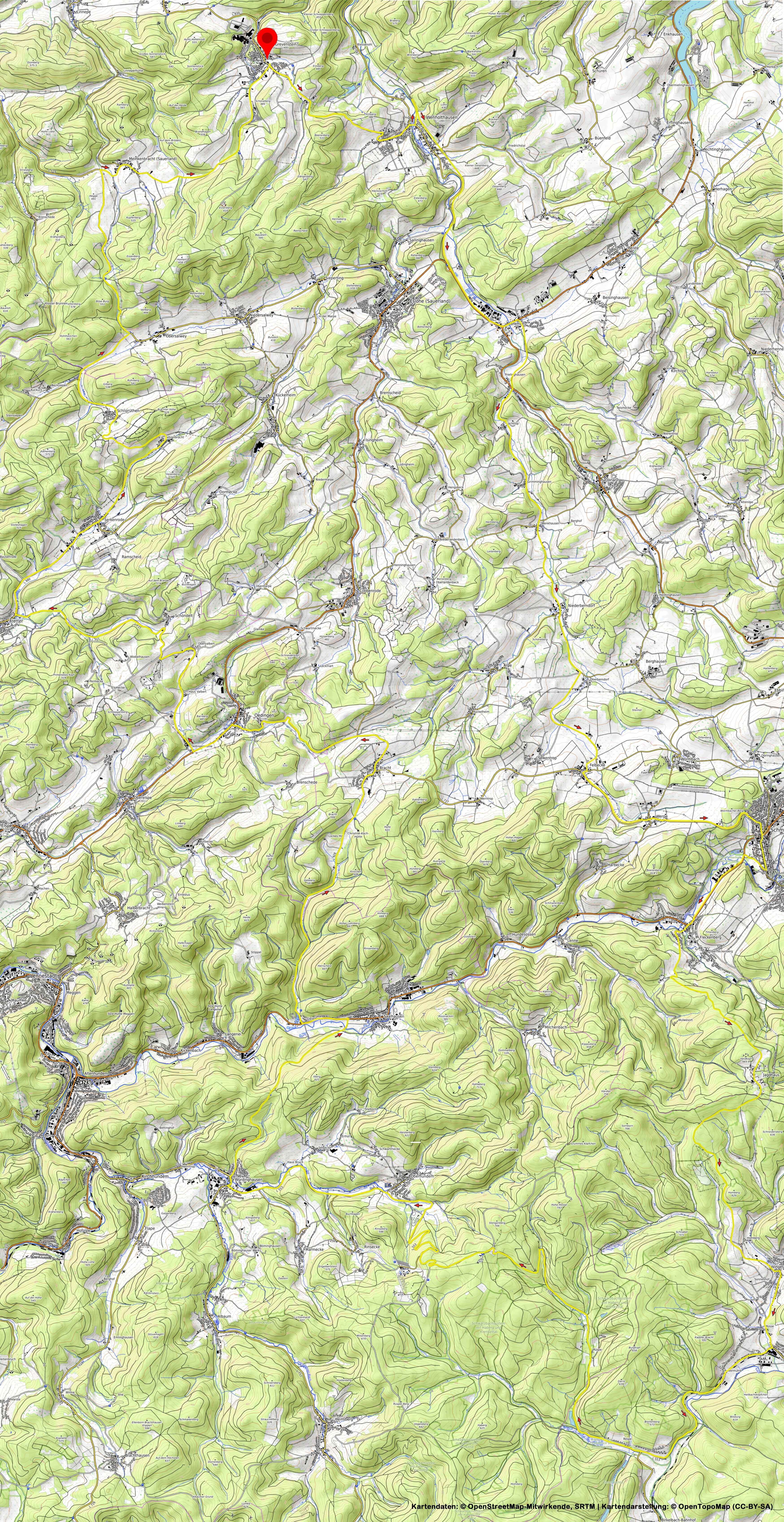 . Von dort talabwärts bis in den Ort Fretter hinein. An der Kreuzung rechts, Richtung Serkenrode/Eslohe. Wir bleiben auf der Landstraße und fahren in die Ortsmitte von Serkenrode, an der abknickenden Vorfahrt geradeaus weiter nach Fehrenbracht, in einer Schleife um den Ort und hoch über die Kuppe ins Fachwerkdorf Schliprüthen. Jetzt geht es das Salweytal runter, bis kurz vor den Ort Obersalwey. Hier kreuzen wir die L519 und halten uns links, Richtung Sundern. Jetzt kommt eine 15%-Rampe und es geht den sogenannten Birkenbrauck hoch. Wehmutstropen: die Rampe ist nur 1,1km lang! Oben rollen wir gemächlich runter bis zur Kreuzung, dort rechts in den Ort Meinkenbracht und auf gerader Ortsdurchfahrt weiter bis nach Grevenstein, ein kurzer Schlußanstieg und in schneller Abfahrt runter, am Skilift vorbei und wir erreichen den Ausgangspunkt.