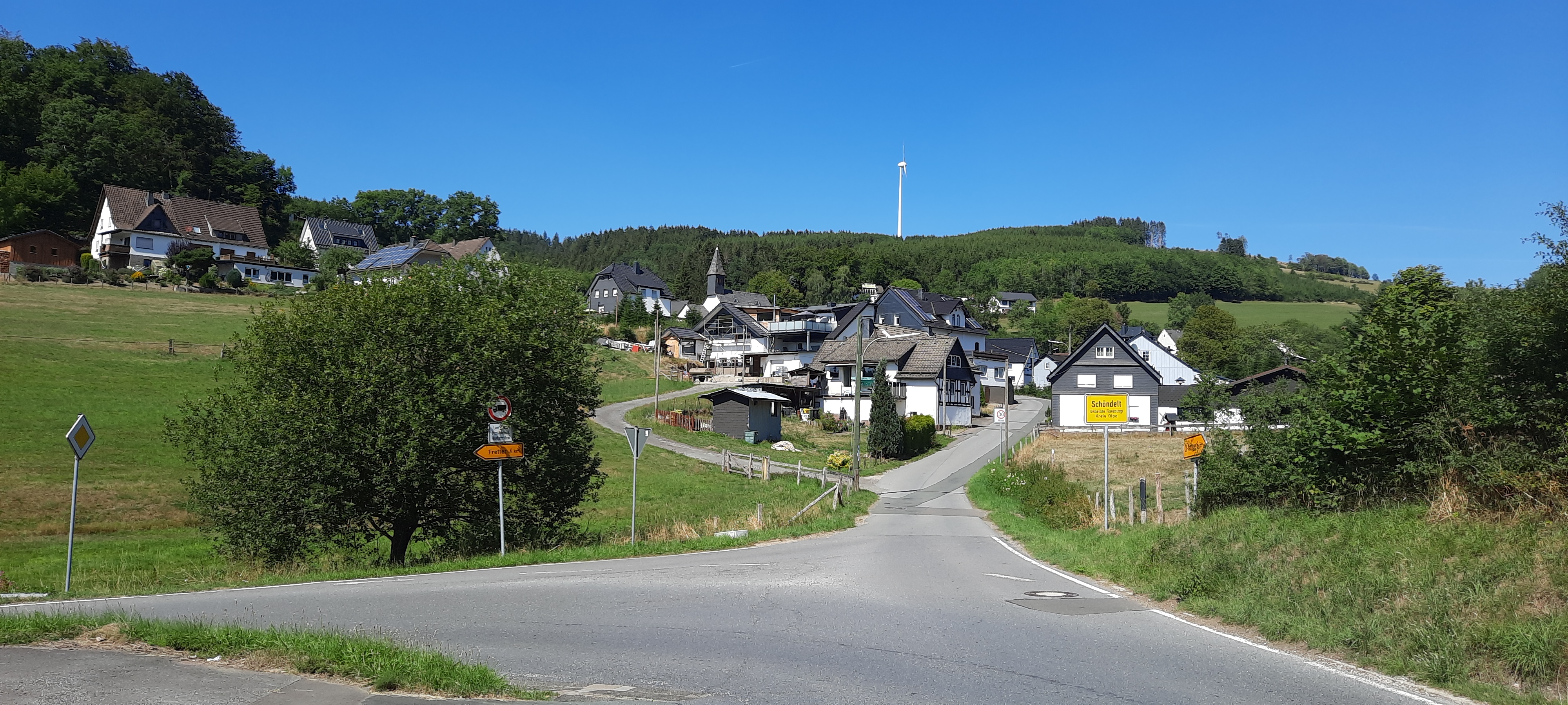 Hier halten wir uns links, Richtung Oedingen. Am Ortsausgang von Bracht erwartet uns ein Panoramablick über das Havelland, eingesäumt von der Hunau und dem Rothaargebirge. Nach der Kuppe geht es schwungvoll runter nach Oedingerberg und in den Ort Oedingen. Unten an der Kreuzung links, Richtung Elspe. Wenige 100m nach dem Ortsausgang verlassen wir den Radweg und es geht rechts ab, durch den Ort Obervalbert hoch über die Kuppe nach Schöndelt