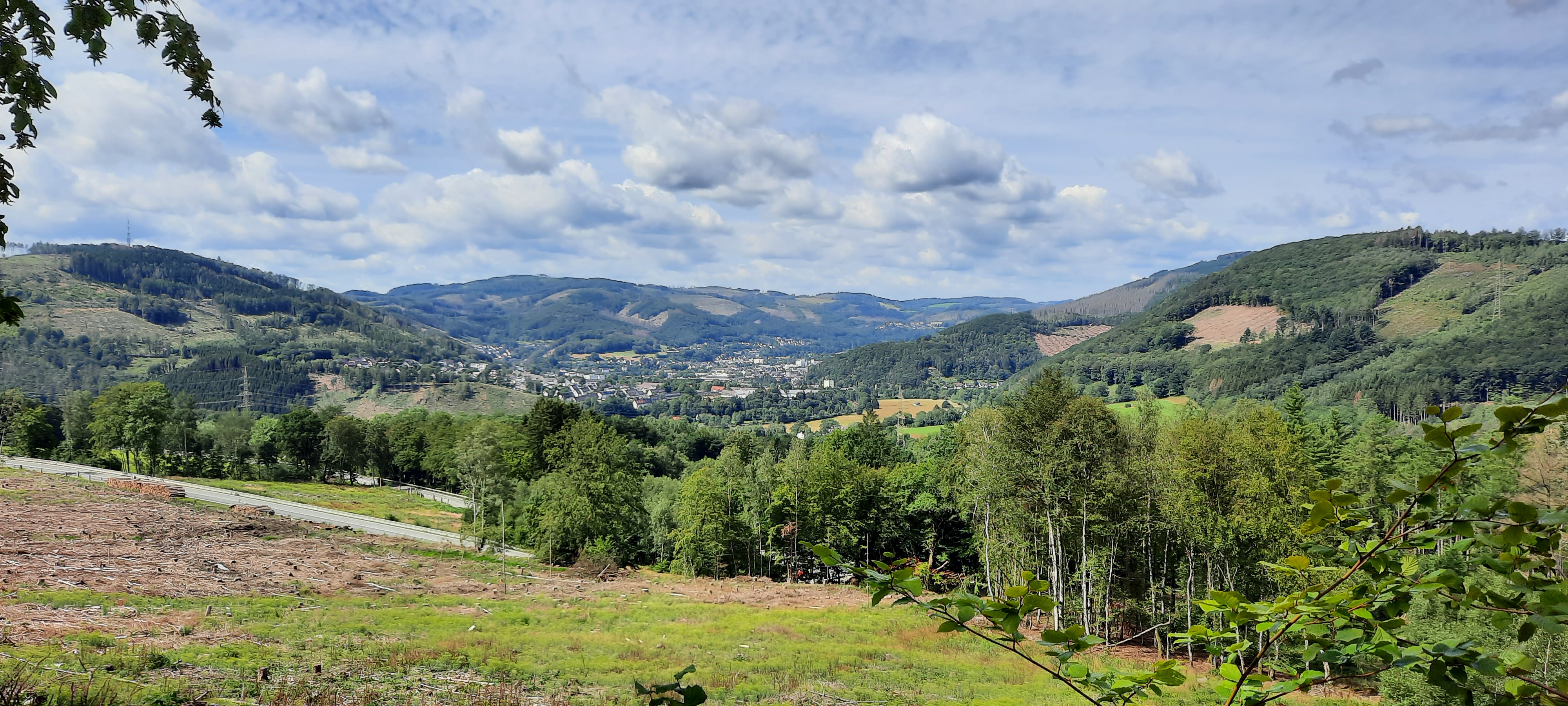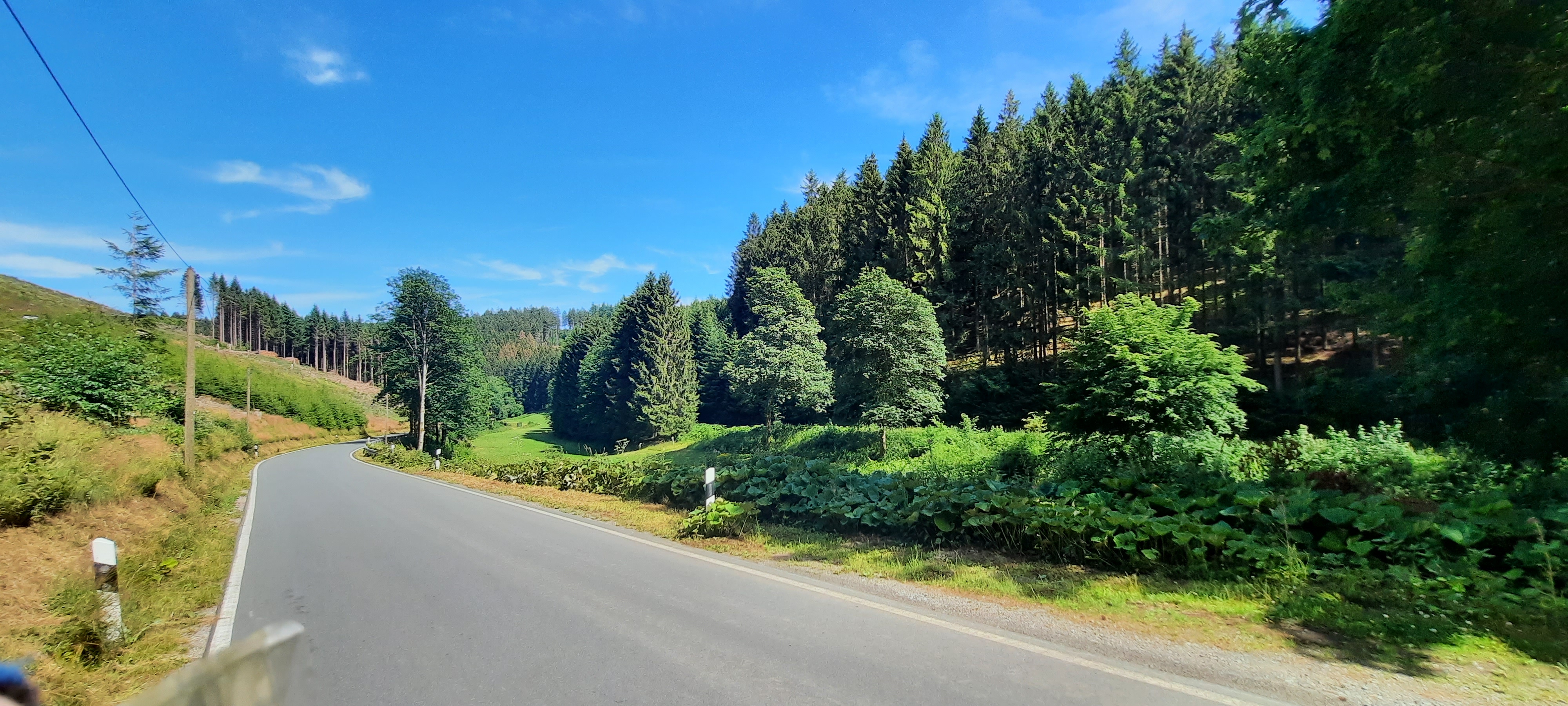 Jetzt halten wir uns erstmal rechts und fahren lenneabwärts über die B236 bis in die Ortsmitte von Eiringhausen. An der Ampel rechts hoch und sofort links einordnen und an der zweiten Ampel links abbiegen, Richtung Affeln. Jetzt geht es ordentlich bergan (die Kette wird ganz links laufen!). Die 230 Höhenmeter auf der L697 aufwärts haben es in sich. Oben geht es dann moderat runter nach Birnbaum (2 Häuser) und geradewegs weiter nach Affeln. Hier halten wir uns links, Richtung Neuenrade / Küntrop (rechts im Bild) und folgen der Landstraße, durch die Senke bis zum Ortseingang nach Küntrop. Hier geht es links über die B229 durch Küntrop weiter bis zur Ortsmitte von Neuenrade. An der Kreuzung (mit Ampel) halten wir uns rechts, Beschilderung/Altena, und es geht wieder ordentlich bergrauf, zum (Auffahrt zum) Kohlberg. Oben vor dem Gipfel hat Kyrill für eine gute Fernsicht gesorgt, und ein kleiner Stop um rückwärts zu schauen lohnt sich.