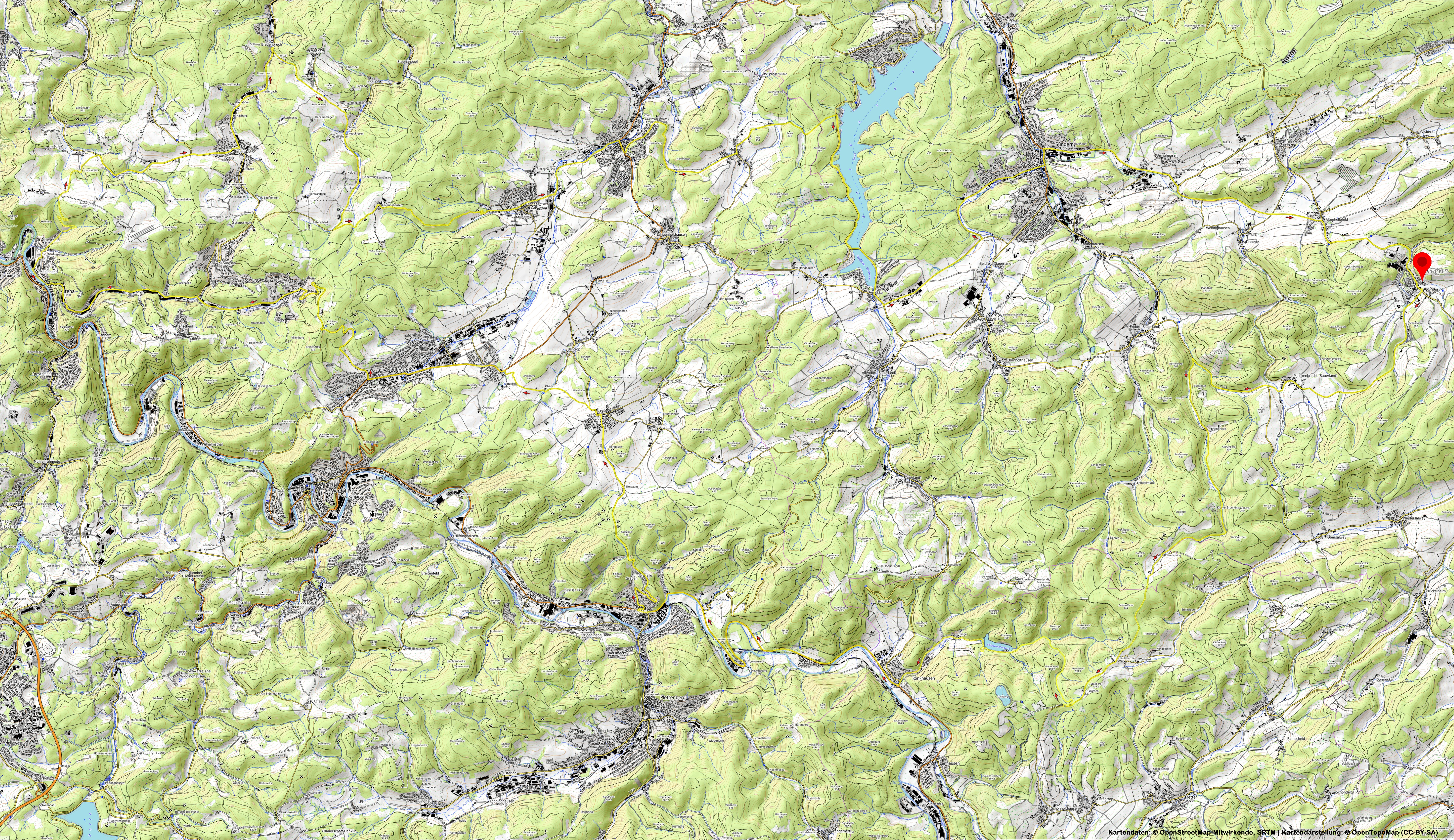 Hier unterqueren wir eine Brücke, wir müssen danach links ab, in einer Schleife über die Brücke, denn es geht eigentlich rechts das Seitental hoch, Richtung Frönsberg. Wir bleiben unterhalb der westfälischen Klinik Hemer und fahren geradeaus weiter, über die Kuppe und dann runter in das Stephanopeler-Tal. Unten im Tal aber wieder rechts bergauf, die letzten 200m auf ganz bescheiden asphaltierter Strecke bis zur Kreuzung, dort links weiter rauf bis Leveringhausen. Hier erwartet uns wieder ein fantastischer Blick und wir werden in schneller Fahrt viele Höhenmeter verlieren. Unten geht es geradewegs durch Garbeck und dann halten wir uns links, nach Balve. In Balve kommen wir in Ortsmitte an eine Kreuzung mit Ampel. Rechts, Richtung Langenholthausen und ca. 400m durch die Einkaufsstraße, dann an der Kirche links rein und auf der Nebenstraße bleiben, bis in die Ortsmitte von Mellen. An der abknickenden Vorfahrt in Mellen geht es links, zum Sorpesee. Unten am See kommen wir auf den Radweg und halten uns rechts, über den Vordamm weiter bis zur Ortsmitte von Amecke. Ein kurzes Stück links, Richtung Allendorf und am Ortsausgangs links rauf, Richtung Sundern. Über die Kuppe und unten in der Senke links rein, in die Settmecke, am Tennisplatz vorbei in die Ortsmitte von Sundern. Am Kreisverkehr geradeaus, dann an der Ampel links und die nächste Ampel (am Sunderlandhotel) rechts, Richtung Hellefeld. Wir bleiben bis in die Ortsmitte von Westenfeld auf der Landstraße und biegen hier an der abknickenden Vorfahrt rechts ab (quasi geradeaus), auf der Kreisstraße nach Altenhellefeld. Hier geht es noch einmal rechts, kurz und knackig hoch durch den Ort, über die Streue (Panoramablick über den Arnsberger Wald) und dann hinab nach Grevenstein, zum Ausgangspunkt zurück.